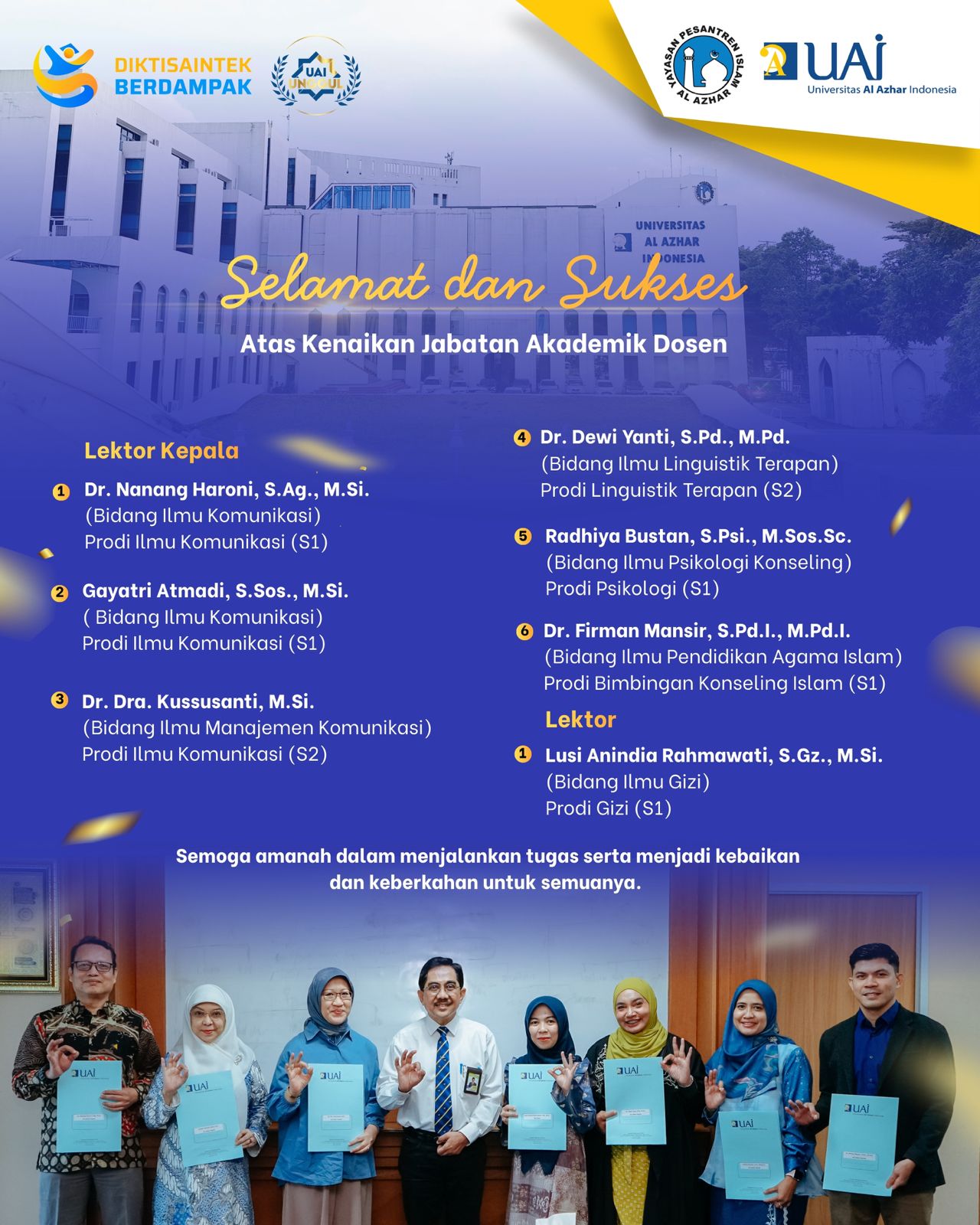 Rektor dan sivitas akademika Universitas Al-Azhar Indonesia (UAI) mengucapkan selamat dan sukses kenaikan Jabatan Akademik Dosen Lektor Kepala dan Lektor. Adapun dosen yang menerima SK tersebut adalah sebagai berikut: